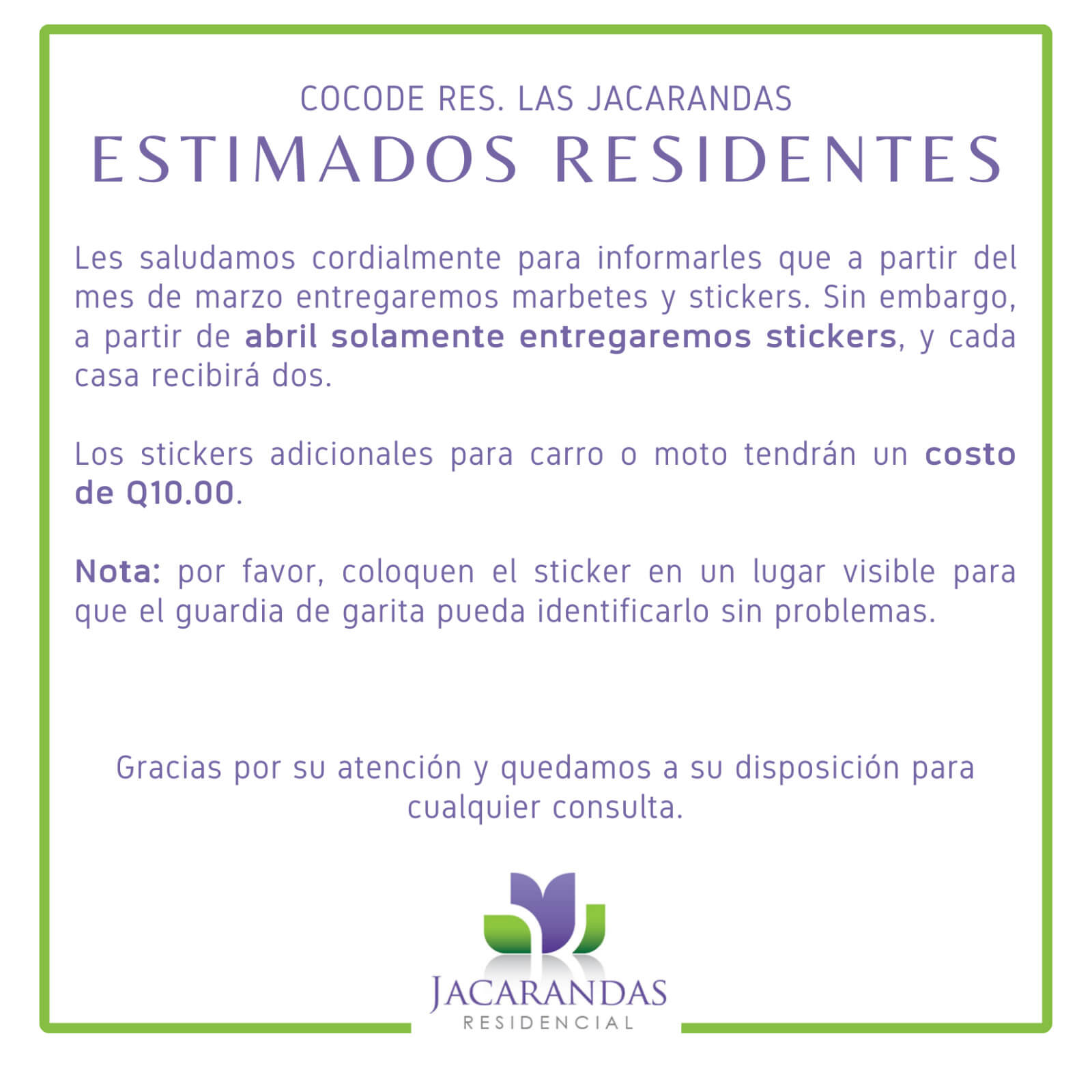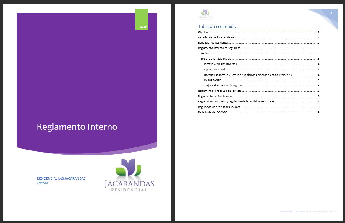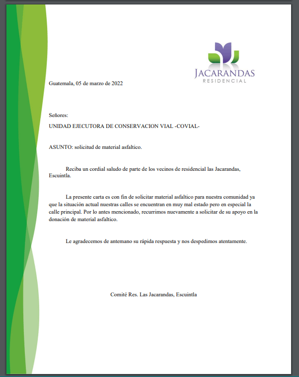 El residencial Las Jacarandas, ubicado en Escuintla, Guatemala, carecía previamente de un comité de vecinos que se encargara de su gestión y administración. Con el objetivo de fortalecer la comunidad y mejorar la imagen de la misma, se tomó la decisión de crear un comité de vecinos. Como parte de este proceso, se diseñó un logotipo para el uso del comité, el cual se utiliza como parte del branding en cartas membreteadas, anuncios, boletines, señalizaciones de tránsito y otros elementos de comunicación.